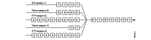 Weighted fair queuing provides an algorithm to identify data streams dynamically using an interface, and sorts them into separate logical queues. The algorithm uses various discriminators based on whatever network layer protocol information is available and sorts among them. For example, for IP traffic, the discriminators are source and destination address, protocol type, socket numbers, and TOS. This is how the two telnet sessions (Sessions B and D) are assigned to different logical queues, as shown in Figure 2-7.
