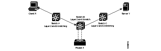 As Figure 2-1 shows, for Client X to communicate with Server Y, which is on another subnet, it must traverse through the following route: first through Switch A (a Layer 2 switch), then through Router A (a Layer 3 switch), and finally through Switch B (a Layer 2 switch). Potentially there is a tremendous bottleneck, which can threaten network performance, because the intersubnet traffic must pass from one network to another.