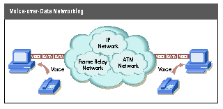 In order for voice over data to become a practical consideration for most organizations, it requires support on a variety of data network types, including IP, Frame Relay, and Asynchronous Transfer Mode (ATM). On an IP or Frame Relay network, technologies must transform "best-effort" communications into functionality that can support both continuous, streaming voice conversations as well as bursty data transmissions. ATM networks can already carry voice, because their design integrates all communications types--including delay-sensitive traffic--over a single network.