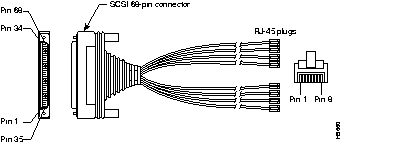 The following illustration shows serial cable CAB-OCTAL-ASYNC= (part number CAB-OCTAL-ASYNC), which is used in the access server series (Cisco 2509 through Cisco 2512). This cable has a male DB-68 (SCSI II) connector on the Cisco end and eight RJ-45 connectors on the network end.