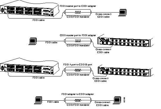 Figure 15-2 shows the most typical configurations for CDDI/FDDI translators. A standard patch cable is used to connect the FDDI side to the media translator. A cross-connect cable is used to connect the CDDI side, except when connecting a workgroup 1000 concentrator (MLT-2), which requires a straight-through cable.
