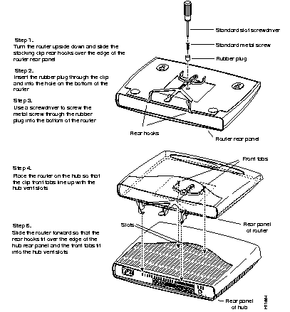 If you include a Cisco 1600 router in the stack, the router must be the top device in the stack. Use the stacking clip as shown in the figure to stack a Cisco 1600 series router on another Cisco product designed to be stacked with the hub.