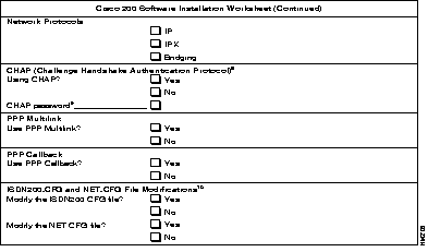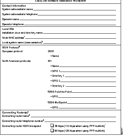 The Cisco 200 Software Installation Worksheet (see Table 2-1) lists the information you should have available before you install and configure the Cisco 200 software. Make a copy of the worksheet and have your system administrator fill it out for your network configuration. Place the completed worksheet in your Site Log.