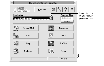 Use Net Launcher as a convenient starting point for connecting to your company network or the Internet and opening the CiscoRemote Plus applications. Net Launcher provides easy access to each application. (See Figure 3-1.) To open an application, click on the corresponding application button in the CiscoRemote Plus Net Launcher window. Net Launcher then connects to your company's network or Internet service and opens the application.