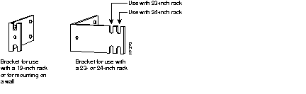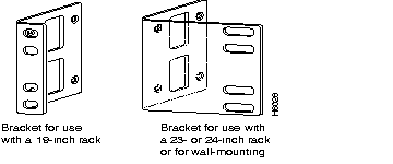 Each router ships with one set of brackets. Brackets for 19-inch racks are shipped unless you specify 23-inch or 24-inch brackets at the time of your order. The Cisco 3620 router requires 19-inch rack brackets to mount on a wall, and the Cisco 3640 router requires 23-inch or 24-inch rack brackets to mount on a wall. Figure 8 shows the wall-mount brackets.