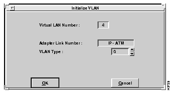 To initialize a VLAN, select the OK option from the Initialize VLAN window. If the Cisco ATM SBus adapter identifies a problem with the initialization, an error message will appear (for example, "Error in Initializing VLAN"). If an error message appears, check to see if you have already added the VLAN (for example, by selecting the Configuration option from the Virtual LAN Options window).