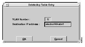 To delete an entry from the client ARP table, select the Delete Entry option from the Client ARP Table window. The Delete ARP Table Entry window appears, as shown in Figure 6-19. Enter the IP address of the entry you want to delete and select OK. The specified IP entry is removed from the client ARP table for the specified VLAN number.