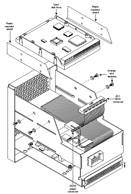 Step 10 Locate two connectors on the disk assembly: the connector labeled JH-1 on the SCSI ribbon cable referred to in Step 6, and a smaller, 3-wire power connector labelled DCHD. Both connectors are called out in Figure 4.