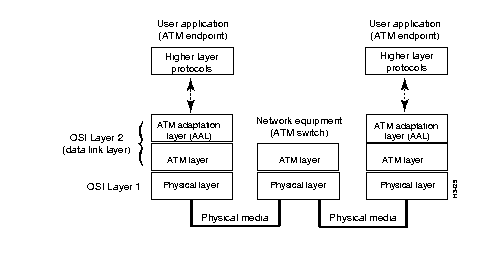 ATM standards define protocols that operate at Layer 2 (the data link layer) of the International Standards Organization (ISO) seven-layer Open Systems Interconnection (OSI) reference model. Figure 1-3 shows the layered architecture of the OSI model.