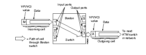 When the Boston switch receives an incoming cell on port 1 with label M, it consults the routing table and finds that label M should be replaced with label X, and that the cell should be passed out of the Boston switch on port 7. The cell is then transported to the switch in the network that is connected to port 7 of the Boston switch, as shown in Figure 1-5.