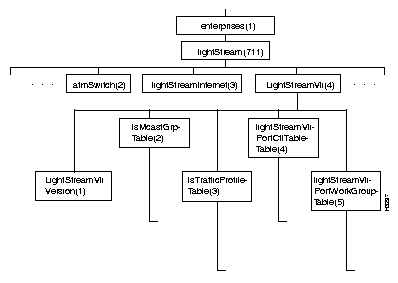 Figure 7-21 shows the lightStreamVli subtree in the LS2020 private MIB. (The lightStreamVli object is defined near the beginning of the MIB file.)