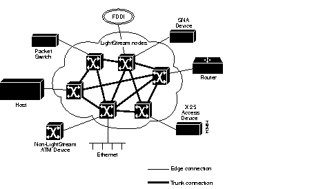 LS2020 switches are connected to one another by trunk connections. Edge connections link LS2020 nodes to devices outside the LS2020 network backbone (see Figure 2-1).