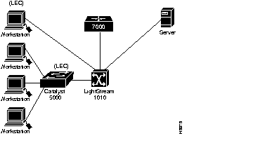 The LightStream 1010 provides an interface to switched LANs across an ATM network, providing LAN users with access to ATM-based services. LAN Emulation (LANE) extends virtual LAN (VLAN) throughout the network by establishing ATM connections between clients and servers. Figure 1-7 shows an example of an ATM LANE configuration.