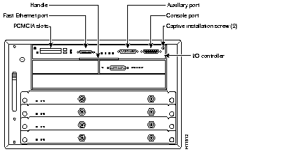 The front of the Cisco uBR7246 provides access to an I/O controller, up to two network interface port adapters, and up to four cable modem cards (see Figure 1). The I/O controller contains the following: a local console port for connecting a data terminal (or data terminal equipment [DTE]) and an auxiliary port for connecting a modem (or other data communications equipment [DCE]) or other devices for configuring and managing the router; two Personal Computer Memory Card International Association (PCMCIA) slots for Flash memory cards; an optional Fast Ethernet port. The Fast Ethernet port provides a 100-Mbps connection to the network.