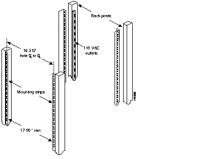 Some equipment racks provide a power strip along the length of one of the mounting strips. Figure 3-1 shows a typical 4-post equipment rack with a power strip along one of the back posts. If your rack has this feature, consider the position of the strip when planning fastener points and ensure that you will be able to pull port adapters and other FRUs straight out of their respective slots.