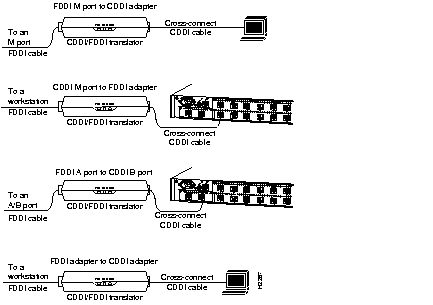Figure D-2 shows examples of modular cross-connect cables used for CDDI/MLT-3 connections between various devices using the CDDI-FDDI translator.