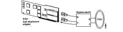 You can connect an optional bypass switch to dual attachment adapters to maintain connectivity to the FDDI ring. If a station enters a fault condition or is powered down or rebooted, the ring will not wrap if a bypass switch is present on the faulty station. Figure 3-1 shows how the bypass switch connects to the network and dual attachment adapter.