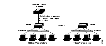 The BMM can connect 10BaseT devices (such as hubs, switches, and routers) and at the same time interconnect to 10BaseT and 100BaseT networks. Figure 2-1 shows how the BMM can provide a connection between a 10BaseT device and a 100BaseT switch or router. In this example, the FastHub has a distance between end-nodes of up to 100 meters.