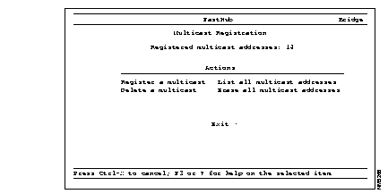 Register a multicast--Register or replace a multicast address. You are prompted for the multicast address to register and the list of ports where frames destined for the registered address are forwarded. Enter the address using six hexadecimal octets, in the format hh hh hh hh hh hh.