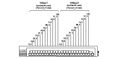 | Bandwidth utilization | Use the LEDs to determine what percentage of the hub total bandwidth is being used at any one time. Figure 1-4 and Figure 1-5 illustrate this function. |