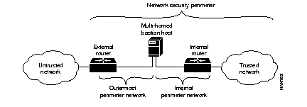 - In rarer cases, bastion hosts are used as one of three components to construct a firewall system--the component that inspects network traffic at protocol layers above the Internet layer. The remaining two components are routers: one known as the internal router (separating the perimeter network from the internal network) and the other known as the external router (separating the perimeter network from the external, or untrusted network). Because bastion hosts only contain one network interface card, this computer cannot protect itself against IP spoofing attacks. Therefore, to prevent IP spoofing, the bastion host must be positioned between two routers; one router filters all requests from untrusted networks and the other filters all requests from the trusted networks to ensure that no spoofed packets reach the bastion host. These routers also verify that all network traffic that passes between them is addressed to the bastion host only. Figure C-1 depicts a firewall system that is constructed using a bastion host and two routers.