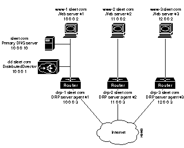 This identifies the distributed servers with IP addresses 10.0.0.2, 11.0.0.2, and 12.0.0.2, as members of the www-servers.sleet.com domain.