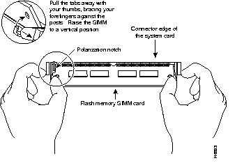 Step 6 Insert the new DRAM SIMM by sliding the end with the metal fingers into the SIMM connector socket at approximately a 45-degree angle to the system card. Gently rock the SIMM back into place until the latch on either side snaps into place. Do not use excessive force because the connector may break.
