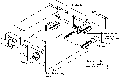 ![]() | Caution Some network processor modules are secured to the rear of the chassis with two external screws. On modules with external rear mounting screws, including multimode Fiber Distributed Data Interface (FDDI) modules, these screws must be removed before the module can be safely lifted out of the chassis. |