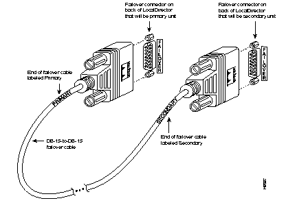 Attach the end of the cable labeled "Primary" to the unit that will be the primary unit, as shown in Figure A-2. Attach the other end to the secondary unit. Connect interface 0 on both LocalDirector units to the hub or switch that goes to the outside network, and connect interface 1 on both LocalDirector units to the hub or switch that connects to your servers.