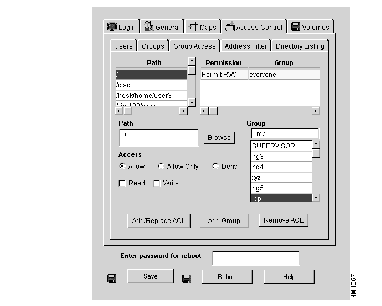 Step 6 Select the appropriate Access group radio button and check the Read or Write check boxes that you want to apply to the group for the resource. Selecting the Allow Only radio button allows only the specified group access and restricts all other groups from accessing the path. If two different groups are given allow only access to the same path, the conflict may cause no one to be able to get access to the path.