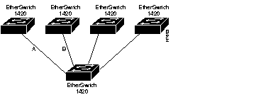 Figure 3-3 shows three EtherSwitch 1420s connected to a concentrator. Each EtherSwitch 1420 is configured with an FDDI Fiber SAS module and a 100BaseTX module for a local server connection. This configuration could also apply to an EtherSwitch 1420 connected to a server or router port.