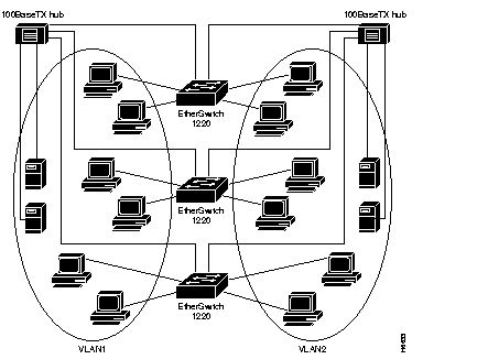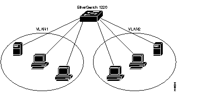 Figure 3-1 illustrates a simple VLAN configuration that groups workstations attached to an EtherSwitch 1220, ports 1 through 12, and a server attached to port A, into VLAN1. Workstations attached to ports 13 through 24 are grouped with a server attached to port B into VLAN2. The traffic on one VLAN is completely isolated from the traffic of the other.