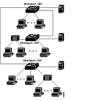 Multiple EtherSwitch 1420s or 1220s can be connected via shared 100BaseT using a multiport repeater in an EtherSwitch 1420. More high-speed server connections can be added by using additional EtherSwitch 1420 modules, as shown in Figure 2-3.