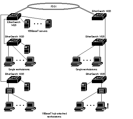 EtherSwitch 1420s and 1220s can connect to a 100BaseT backbone switch or router, as shown in Figure 2-4. With support for full-duplex operation, each 100BaseT link supports up to 200 Mbps of bandwidth and fiber-optic cabling distances of up to 2 kilometers.