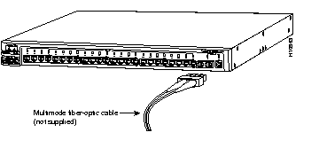 Step 1 Remove the rubber caps from the cable and insert one end of the fiber-optic cable into the 100BaseFX port on the switch, as shown in Figure 2-11, pushing until it snaps into place.