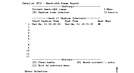 This report displays the peak bandwidth of the network during a given period of time. The switch displays a list of the last twelve recordings of maximum bandwidth, in Mbps, according to a time interval you set. Display this report, shown in Figure 5-30, by pressing U on the Main Menu and B on the Usage Summary Menu.