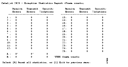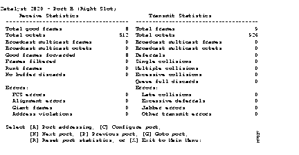This section describes statistics generated by the Catalyst 2820 and 1900 Management Console. If you are using VT100 terminal emulation, the screens displaying the statistics are refreshed every 5 seconds. If you are connected to the Management Console via a modem running at less than 2400 baud, the screens displaying the statistics are refreshed every 8 seconds.