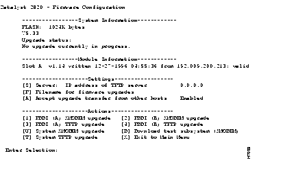 [3] FDDI (A) TFTP upgrade. Initiate a TFTP transfer of FDDI firmware to slot A. The complete procedure is described in the section "Upgrading FDDI Firmware with a TFTP Server."