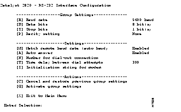 [G] Activate group settings. This option activates the setting you have entered for baud rate, data bits, stops bits, and parity settings. After selecting this option, configure the attached terminal to match the new settings. Enter Y or N at the prompt and press Return.
