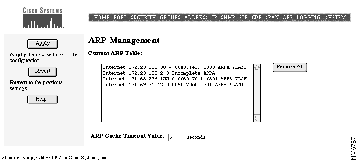 The Address Resolution Protocol (ARP) discovers the MAC address that corresponds to the IP address for a given host. Use this page (see Figure 4-15) to display the current addresses in the ARP table. You can also change the timeout for the ARP table.
