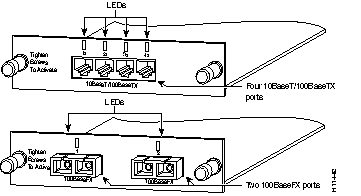 The 100BaseFX module has two switched 100BaseFX ports for 100-Mbps fiber-optic connectivity. The ports can run in half-duplex or full-duplex modes. The ports support the IEEE 802.3u 100BaseT standard and use standard duplex SC connectors. Figure 1-1 shows the 100BaseFX module.