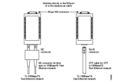 Ethernet transceivers are available from a variety of sources for Virtual Terminal Protocol (VTP) and multimode fiber-optic cabling (100BaseFX at 100 Mbps). Figure 3-2 shows an example of Fast Ethernet transceivers and connection equipment.