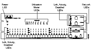 The Catalyst 1700 has an extensive range of LEDs that allow easy and fast troubleshooting. The Catalyst 1700 has a Power LED, Utilization Meter LEDs, Status LEDs, and Network LEDs. These LEDs are shown in Figure 1-6 and described in the following sections.