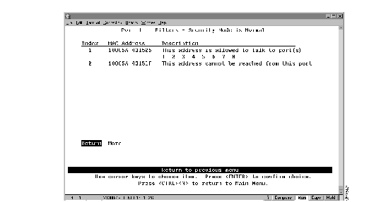 To view the entries in the address table of a specific port, select Port N Address Table on the Status/Statistics Menu and specify a port number. The Port N Address Table panel (Figure 7-7) is displayed. The port address table can contain up to 1790 entries. The entries are listed in the order in which they were encountered.