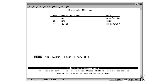 To view or change the community names for the domains of the Catalyst 2600, select Community Strings on the SNMP Configuration panel. The Community Strings panel (Figure 7-18) is displayed. A community name is a name associated with the Catalyst 2600 and a set of SNMP managers that are allowed to manage it with the specified privilege level.