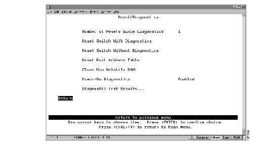 To reset the switch or to obtain diagnostic information, select Reset/Diagnostics on the Main Menu. The Reset/Diagnostics panel (Figure 7-21) is displayed.