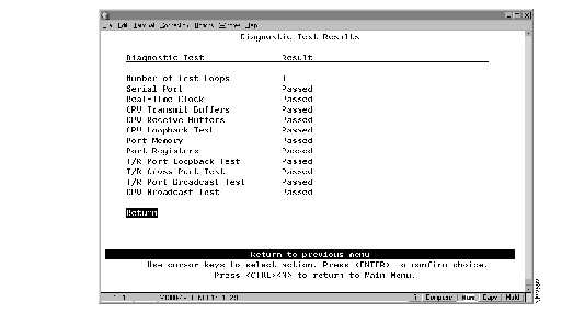 If the Catalyst 2600 is connected to a terminal via the EIA 232 port, the diagnostic messages (similar to those in Figure 7-23) should appear after you reset the Catalyst 2600 with diagnostics. An abbreviated version of these messages will appear if you reset the Catalyst 2600 without diagnostics.