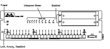 | Utilization meter | This group of ten LEDs measures the Catalyst 2800's current and peak bandwidth use in Mbps. Current bandwidth is shown with a series of lit LEDs topped by a rapidly blinking one. Peak utilization is indicated by the right-most solidly lit LED. The default setting for the capture interval is 24 hours and is recorded at midnight each night. Table 1-2 shows the bandwidth associated with each of the ten LEDs. |
