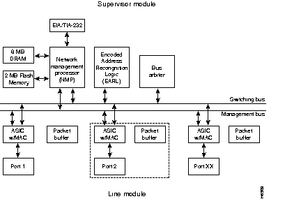 This section describes the interaction of the system components that switch packets through the Catalyst 2900. Figure 1-10 is a simplified block diagram of the system architecture and illustrates the general operation of the switch.