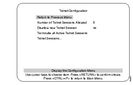 Choice of Yes or No to allow or disallow a new Telnet session. Press RETURN at this selection and use arrow keys to highlight Yes or No and press RETURN.